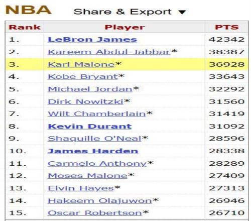 截至目前,詹姆斯以42342分高居歷史總得分榜第一位。