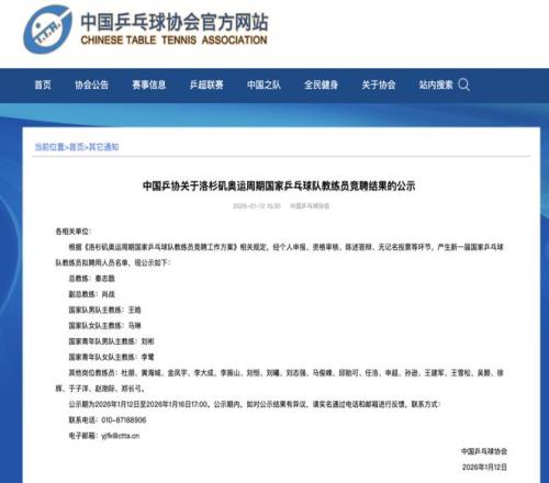 2025年12月20日,中國(guó)乒乓球協(xié)會(huì)曾在官網(wǎng)發(fā)布《中國(guó)乒乓球協(xié)會(huì)關(guān)于舉行洛杉磯奧運(yùn)周期國(guó)家乒乓球隊(duì)教練員競(jìng)聘的通知》,正式啟動(dòng)新周期國(guó)家隊(duì)教練員公開(kāi)競(jìng)聘工作,完成洛杉磯奧運(yùn)周期備戰(zhàn)任務(wù)。