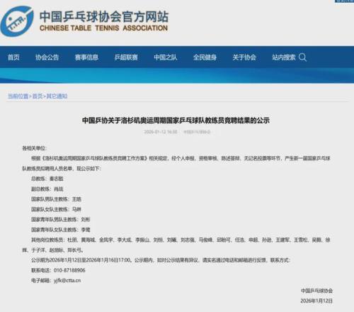 今天(1月12日),中國(guó)乒協(xié)官網(wǎng)發(fā)布“關(guān)于洛杉磯奧運(yùn)周期國(guó)家乒乓球隊(duì)教練員競(jìng)聘結(jié)果的公示”: